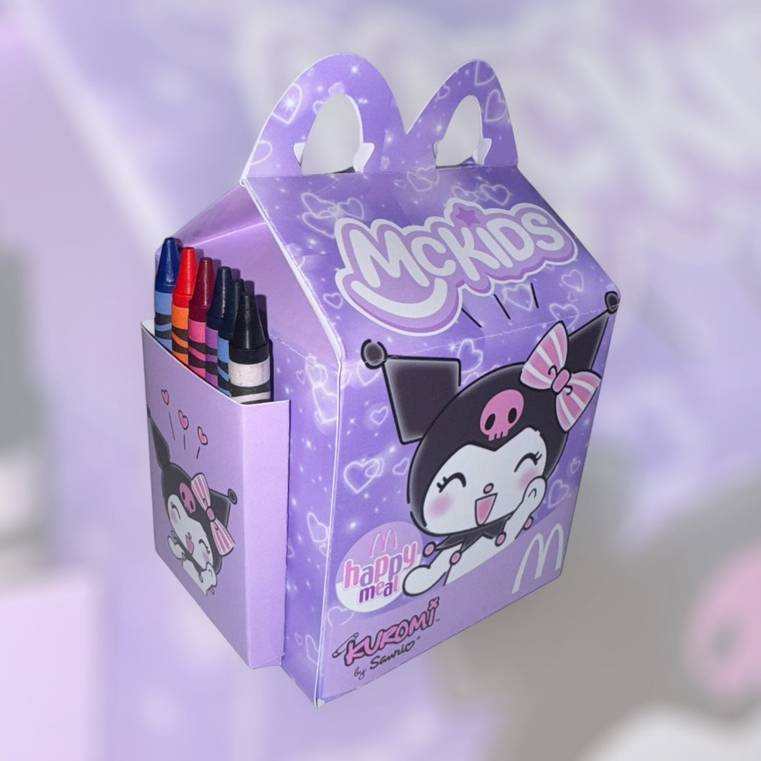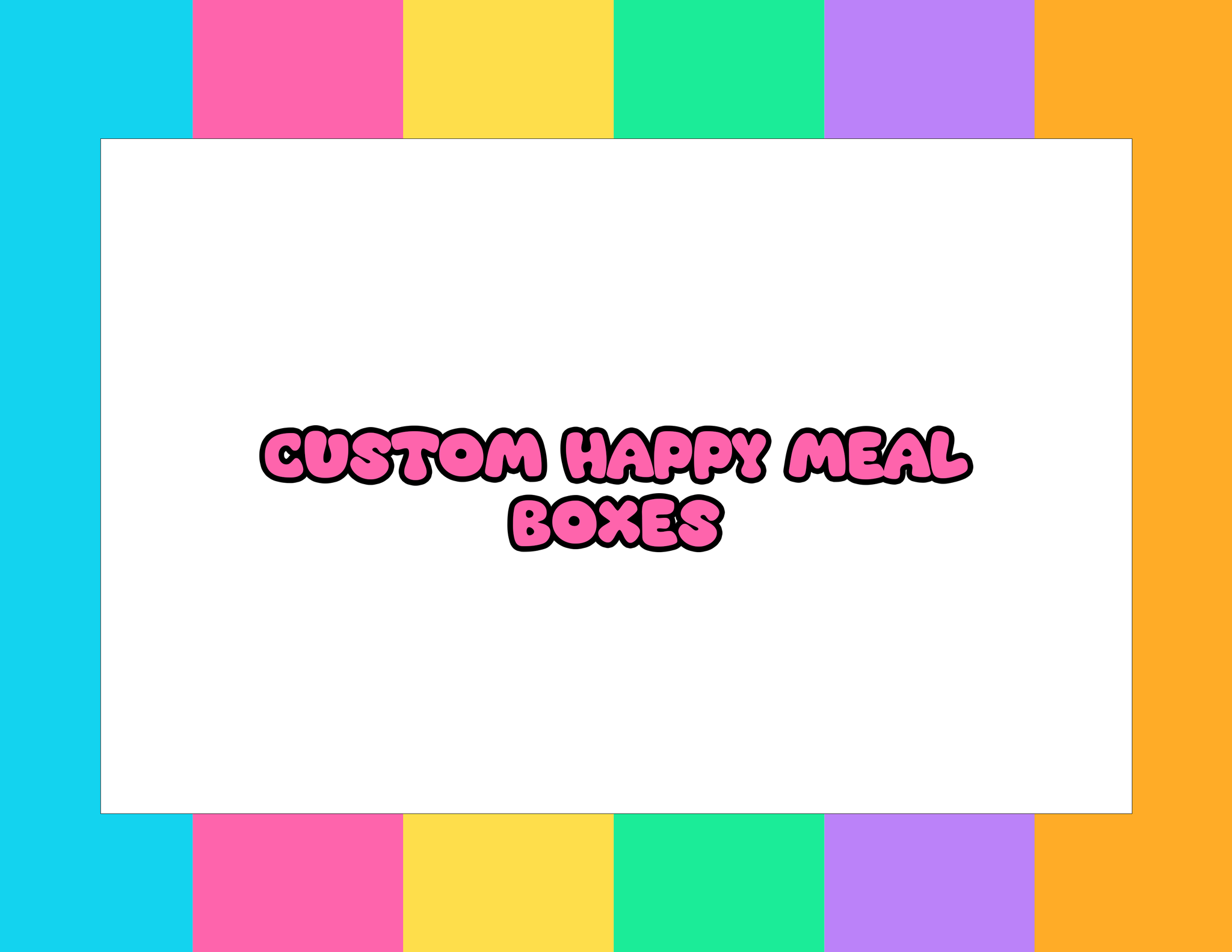Our custom Happy Meal Box is perfect for filling with treats, making it an ideal party favour box. Each box comes with a custom colouring book and crayons.