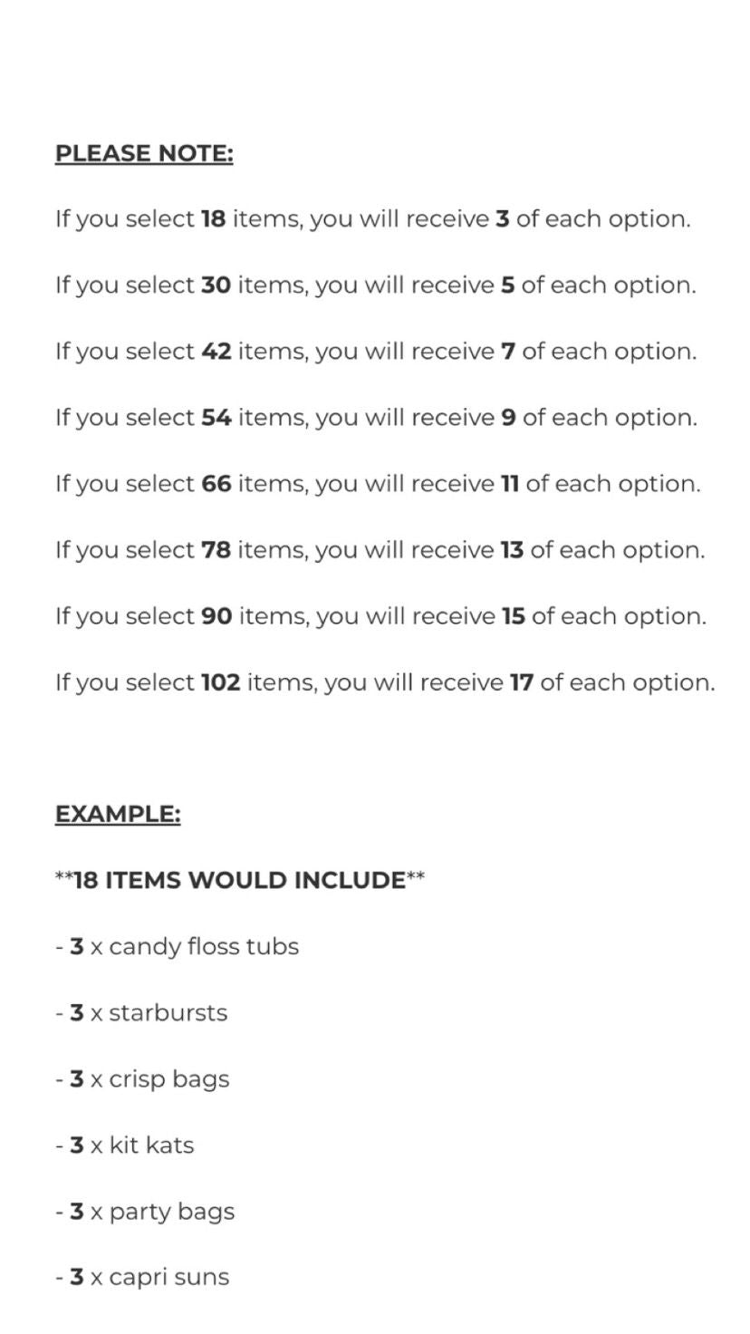 If you select 18 items, you will receive 3 of each option.